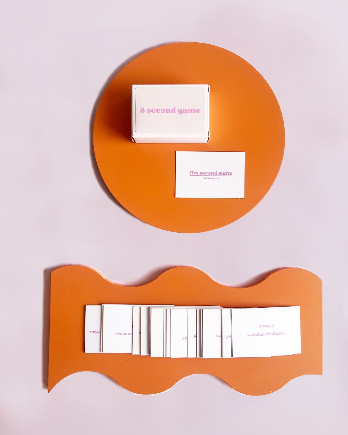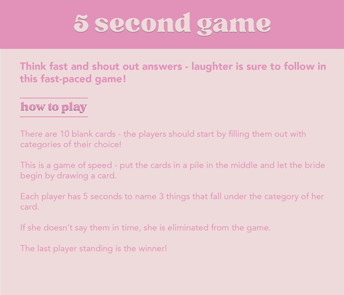 We’ve left 10 cards blank, so start off by passing them around and filling them out with different categories. Then, put the category cards in a pile in the middle and let the bride begin by drawing a card and reading out the category. She then has 5 seconds to name 3 things that fall under the category of her card. If she doesn’t say them in time, she is eliminated from the game. The last player standing is the winner!