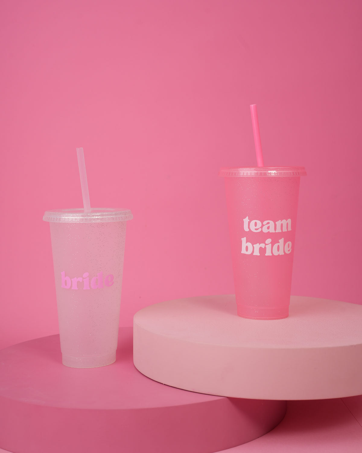 Reusable shimmery pink 24oz straw tumbler with white ‘team bride’ lettering.