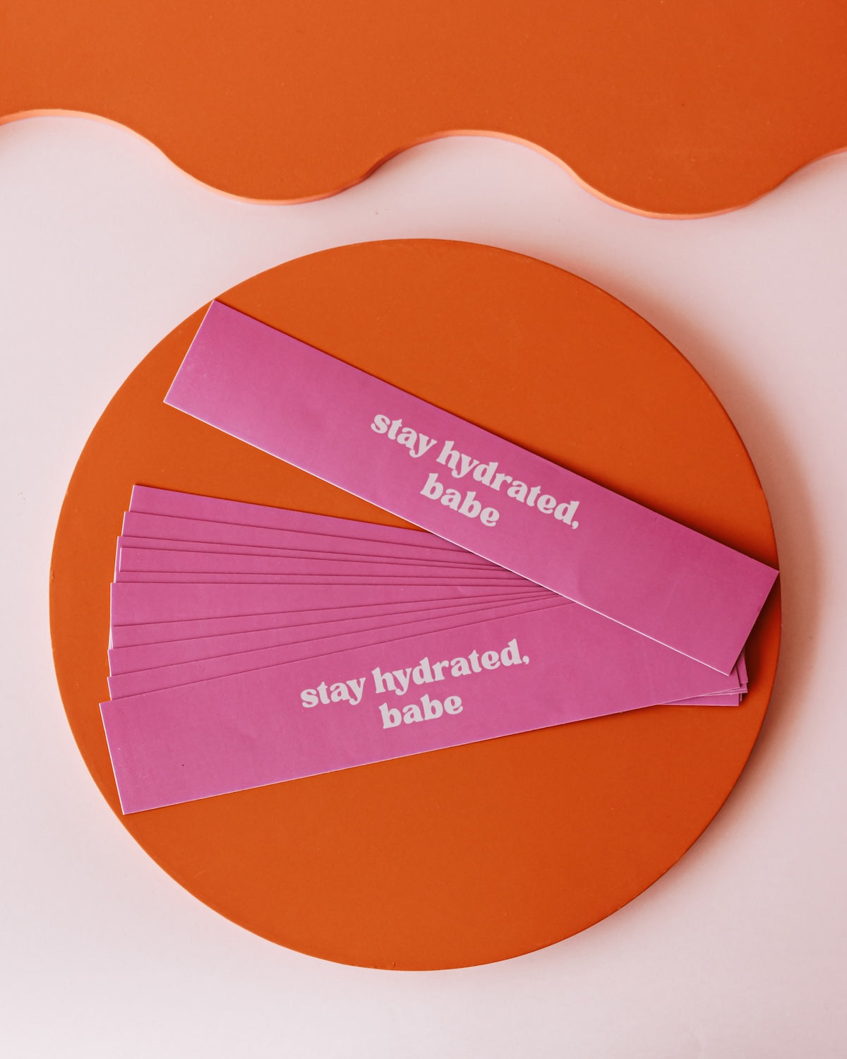 Each pack contains 5 or 10 pink ‘stay hydrated, babe’ water wrap stickers.
