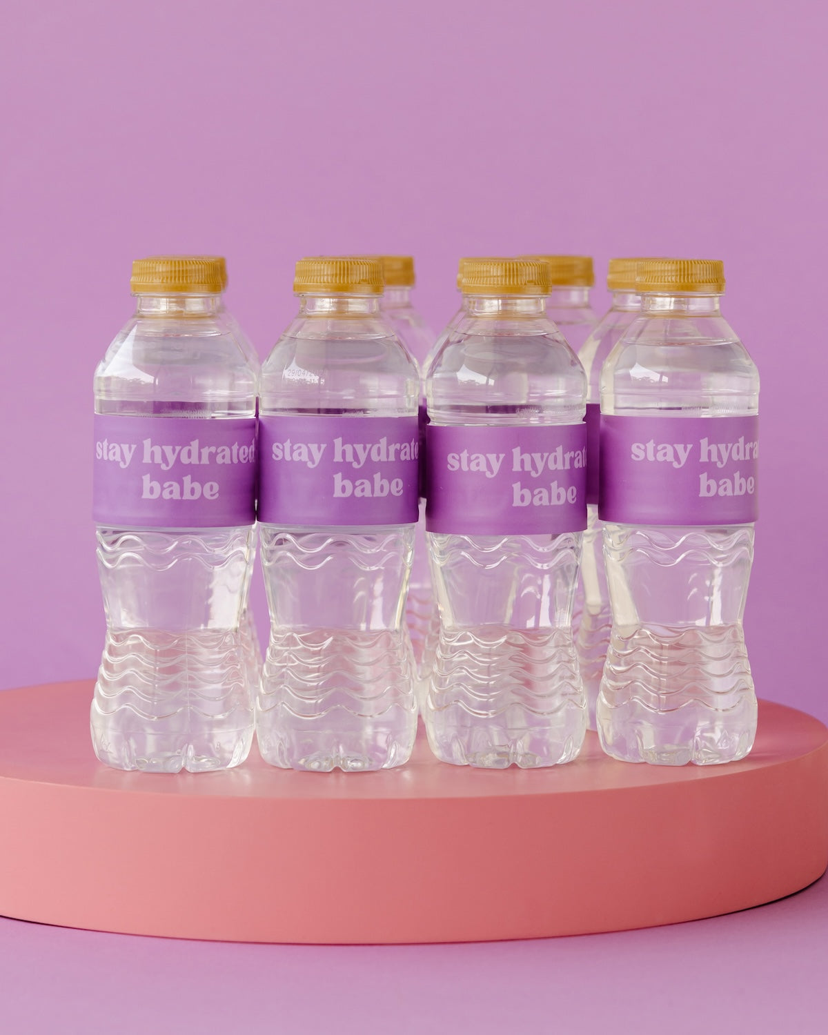 Each pack contains 5 or 10 purple ‘stay hydrated, babe’ water wrap stickers.